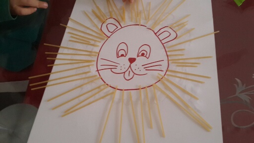 Resim tamamlamanın çubuk makarna versiyonunu gerçekleştirdik etkinliğimizde. Aslanımızın saçlarını (yelelerini), evimizin de tahtalarını yaptık makarnalardan. minik kaslar oldukça çalıştı ve epeyce yoruldular. Dikkat gelişti. Farklı malzemelerden resim yapma; yaratıcılığı da olumlu etkinledi. Kısacası hem eğlendik hem de geliştik.