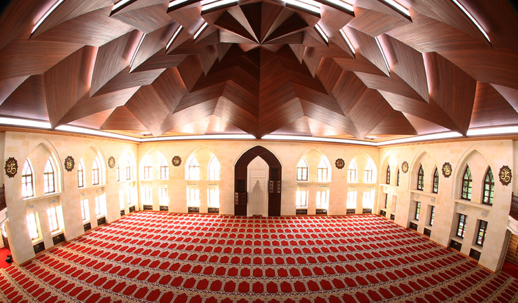 Cami içerisinde taş işçiliği ile dikkat çeken mihrâbın estetiğini; minber, kürsü ve mahfil katının zarif ahşap işçiliği tamamlamaktadır.  Cami bölümünün genel mimarisi ile uyumlu olarak tercih edilen Kırmızı halılarda ise, Kudüs‘te bulunan ilk kıblemiz Mescid-i Aksâ‘nın namazgah bölümü halıları örnek alınmıştır.