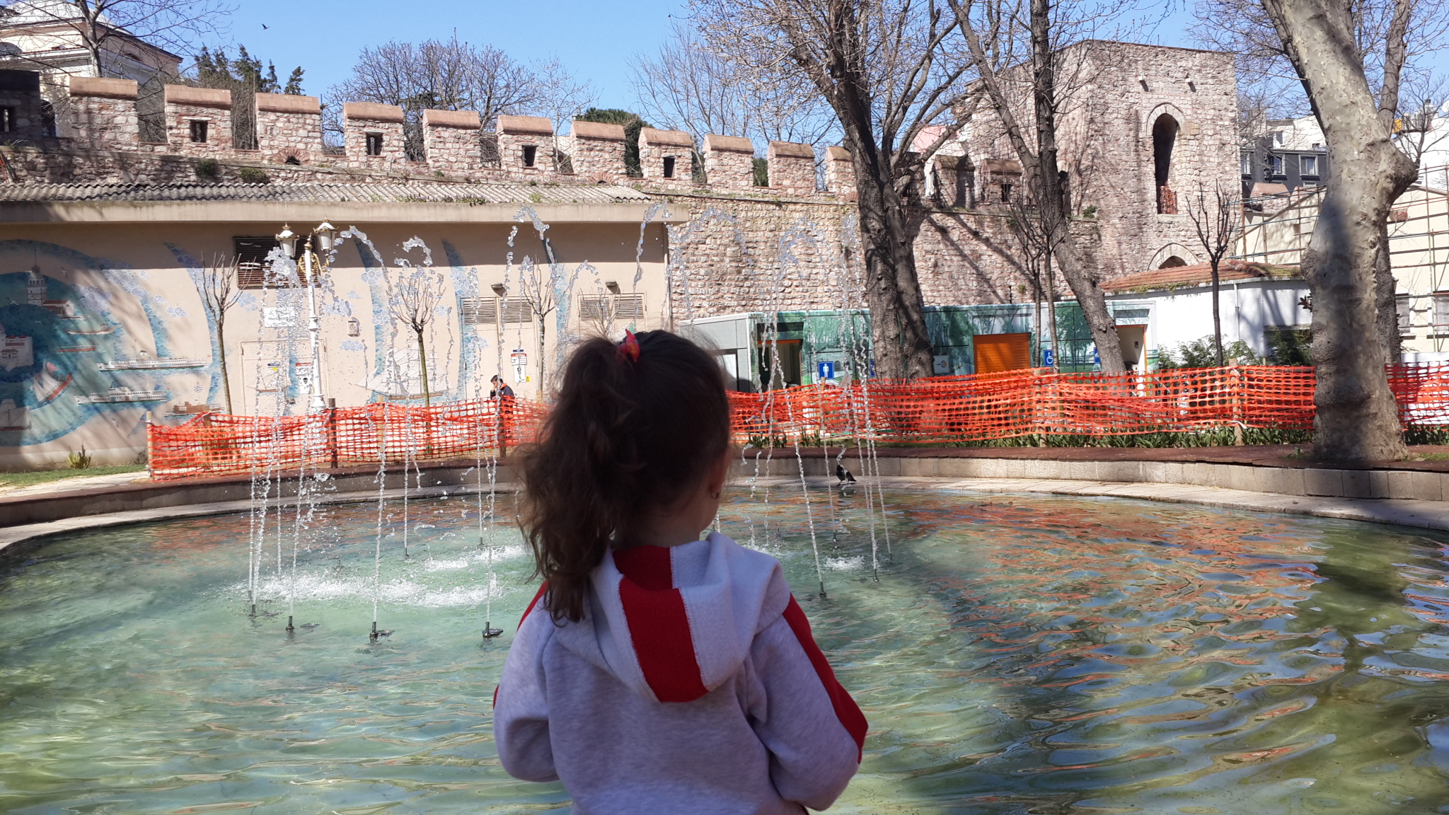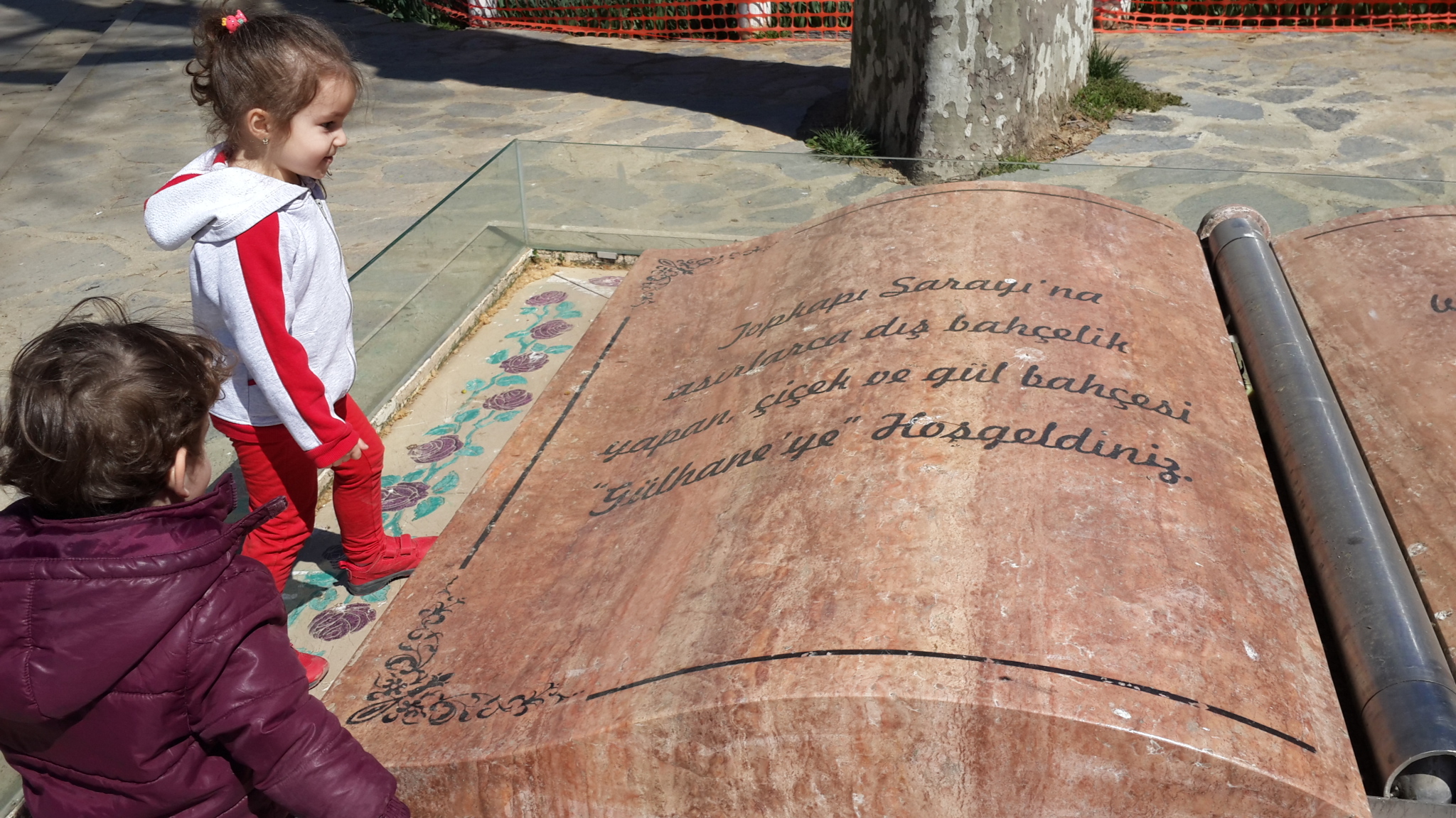 Giriş kısmındaki bu taş kitap ise çocukların çok dikkatini çekti. Üzerini okuduk ve Topkapı Sarayı ile ilgili küçük bilgilerle de Gülhane Parkı’nın değerini pekiştirdik.
