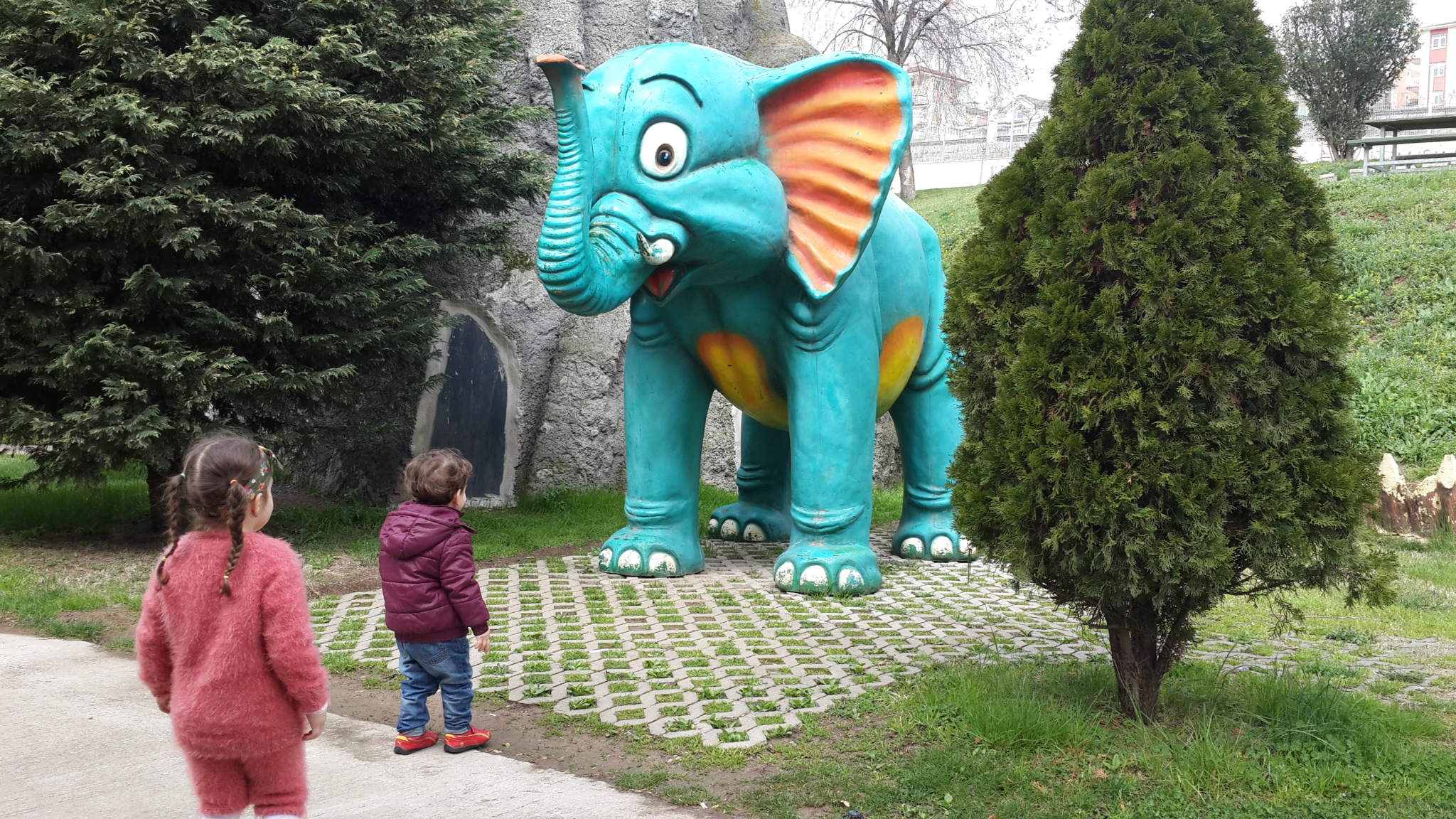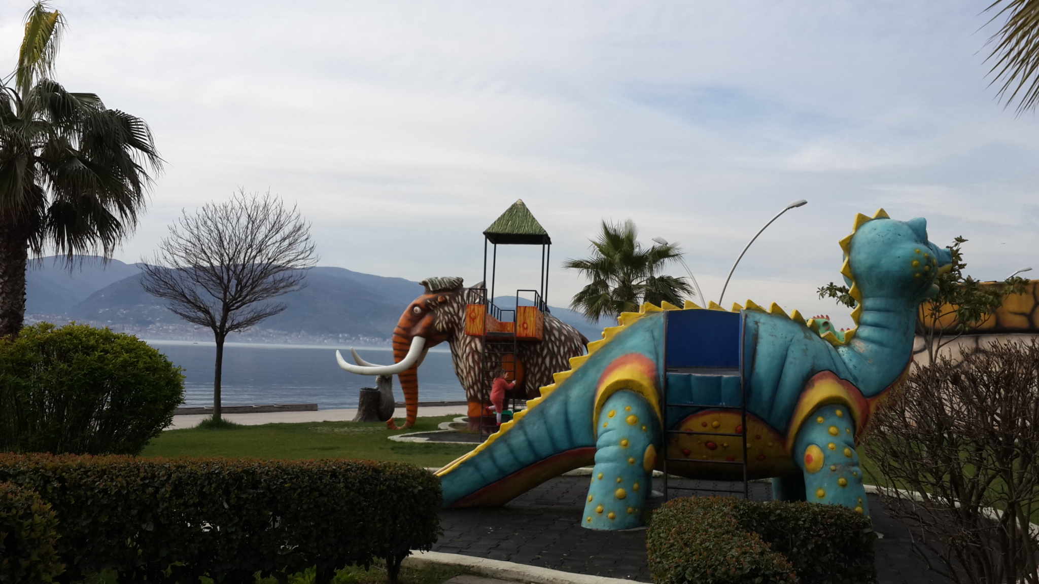 Parkın kaydırakları da çok renkliydi. Mamutlar, dinozorlar her köşede bizi karşılıyorlardı. Kaydıraklardan kaymaya doyamadık 🙂