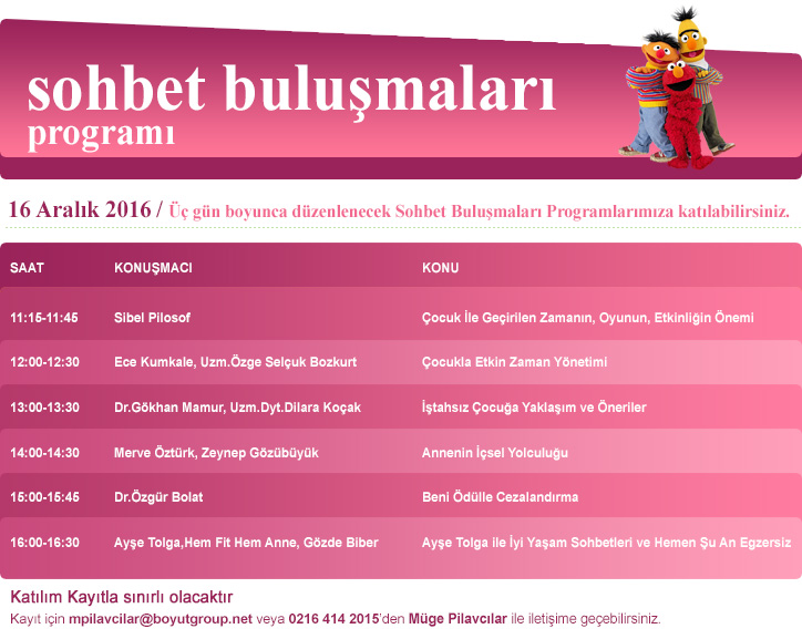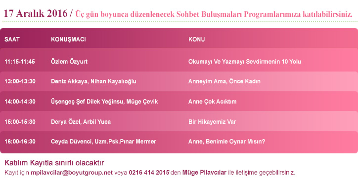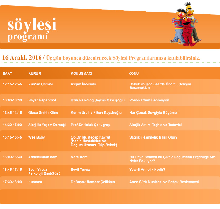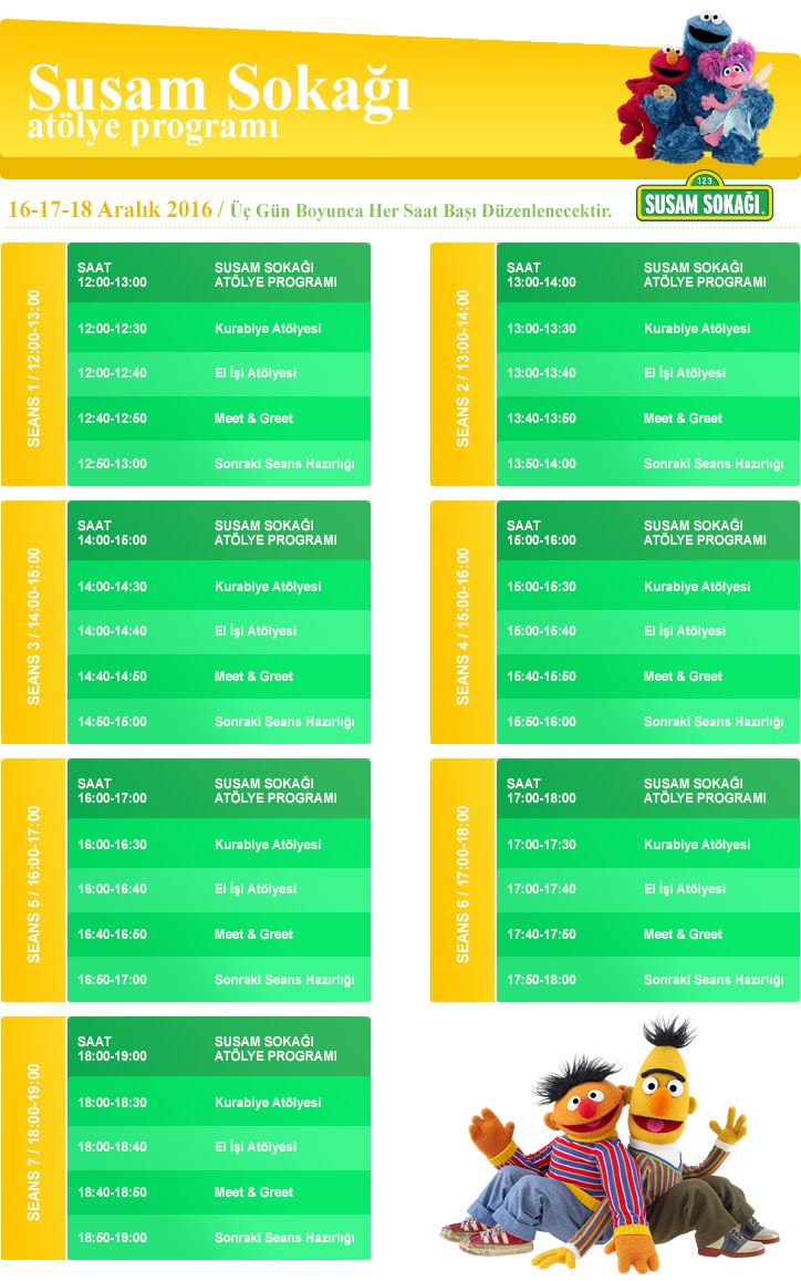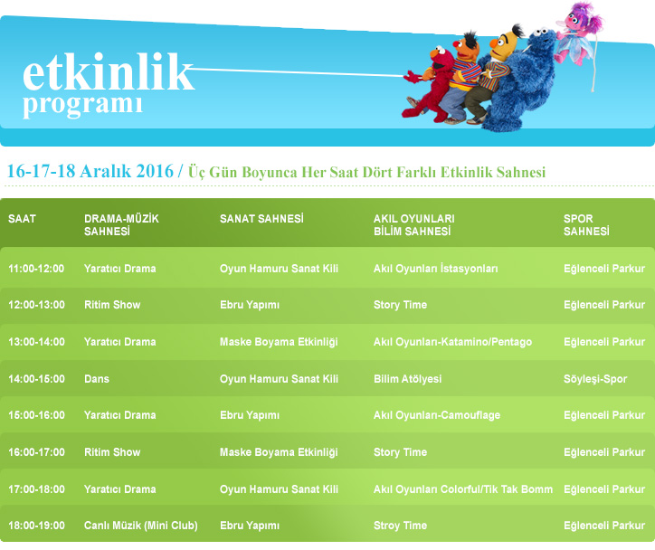 Aileler çocuklarıyla birlikte ödüllü yarışmalara katılabilecek, çocuk parkında gönüllerince oynayacak, çocuk hayranları ile tanışmak için fuara gelen ünlü konuk ve karakterlerle söyleşilere katılacak, fotoğraflar çekebilecek, atölye alanında çocuklarıyla sanat eserleri yaratabilecekler. Etkinlikten etkinliğe koşarken arada soluklanıp, dinlenirken, ailece filmler, sergiler, defileler, dans ve tiyatro gösterileri ile keyifli anlar yaşayacaklar.