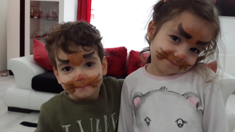 Kitabın sonunda biz de yüz boyama etkinliği gerçekleştirdik ve aslan olduk. Tabii yüz boyası kullanarak 🙂 Hem kitabın konusunun pekişmesini sağladı hem de Pinpin’in yerine kendimizi koyabilmemize yaradı bu yüz boyama etkinliği. Artık biz de Playaço Okulu’nun bir öğrencisiyiz. Bu renkli dünyayı çok sevdik 🙂