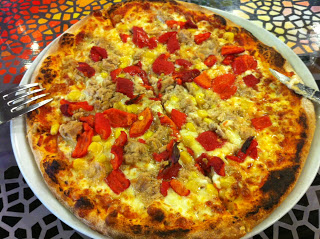 - Öncelikle domates sos kaşık yardımı ile yanlardan biraz boşluk bırakacak şekilde sürülür ardından, rendelenmiş dil peyniri, ufalanmış beyaz peynir ve biberler eklenir.
