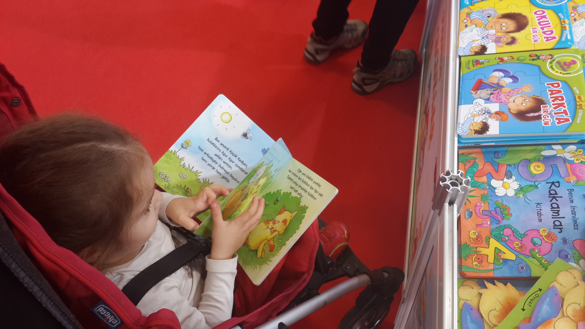 Maratonumuzun uzun süreceğine adım gibi emin olduğumdan Aybike için Kerem’in bebek arabasını ödünç aldım. Böylelikle hem kitaplarımızı koyabileceğimiz ve kolayca taşıyabileceğimiz bir arabamız oldu hem de Aybike çok daha az yoruldu. “Hadi gel şu standa bir bakalım” dediğimde arabasından indi ve kitapları bol bol inceledi. İşi bittiğinde tekrar oturdu. Siz de küçük çocuğunuzla giderken mutlaka bebek arabası bulundurun yanınızda. Yoksa hem çocuk taşırsınız hem de kitap. Eziyete dönüşür fuar keyfiniz.