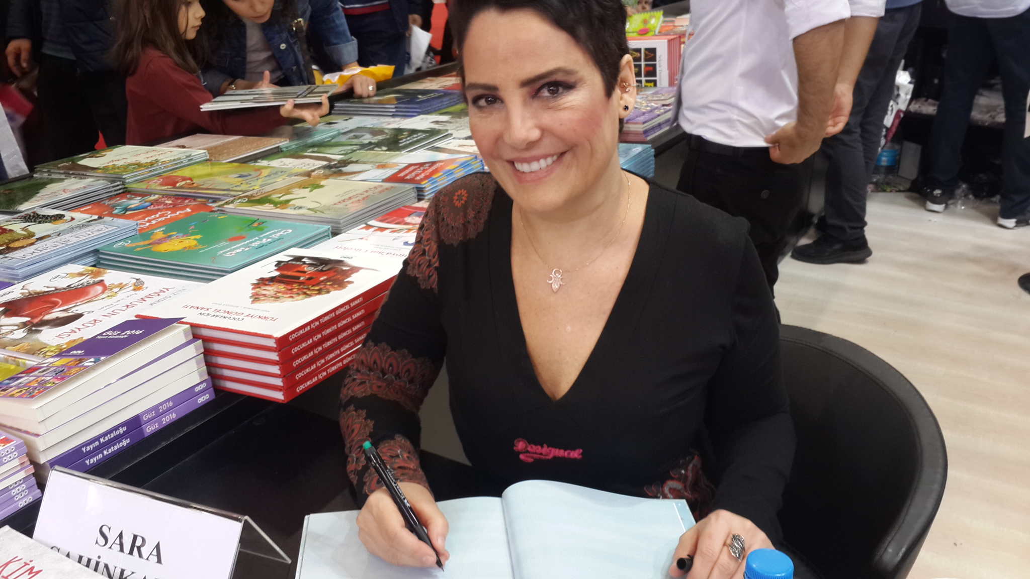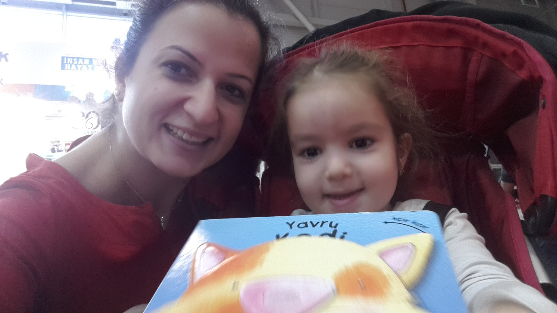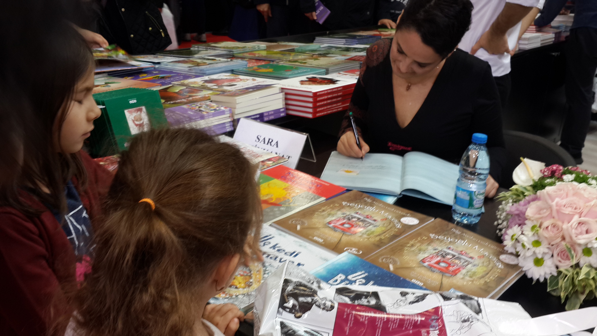 Neredeyse gördüğümüz tüm kedili kitaplara saldırdık. Onlarla hatıra fotoğrafı bile çektirdik. Aybike Esra dört yaşında bile olmamasına rağmen tahmin ettiğimden çok daha fazla ilgilendi fuarla ve kitaplarla. Ben açıkçası kalabalıkta ve uzun maratondan sıkılacağını düşünmüştüm bir süre sonra. Bütün kedili kitapları alamasak da Üç Kedi bir Dilek kitabını aldık. Hatta yazarı Sara hanıma bile imzalattık. Aybike için bu şaşırtıcı bir deneyim oldu. Daha önce Yalvaç Ural’a da kitap imzalatmıştık ama o zamanlar küçüktü ve çok farkında değildi. Bu kez kitapların biri tarafından yazılmış olduğu bilincine vardı. Kendi kendine oluşmadıklarını kavradı 🙂